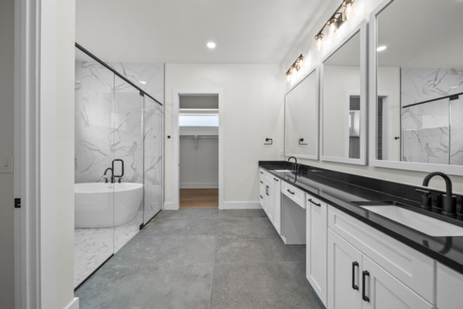 Separate tub/shower in primary bath with glass shower & floor to ceiling tile